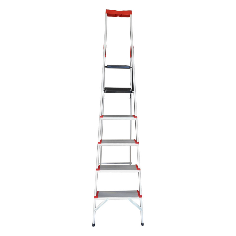 نردبان شش پله یوکسل +2 از جنس آلومینیوم فابریک و نمونه دیزاین آلمانی است. به نسبت نردبان های قدیمی یوکسل، مدل جدید +2 دارای 2 پله ی پهن در بالای نردبان می باشد و نیز ارتفاع آن 25 سانتی متر بیشتر از مدل های قبلی است که این وجه تمایز دسترسی به ارتفاع بالاتر با همان تعداد پله را میسر می سازد. همچنین طراحی 2 پله ی پهن در بالای این نردبان، ایستادن طولانی مدت در پله ی پایینی را هم برای فرد فراهم ساخته است. این نردبان علاوه بر وزن بسیار کم از استحکام بسیار بالایی نسبت به مدل های قبلی برخوردار است و همین قابلیت این محصول را از سایر محصولات مشابه متمایز کرده است. دیگر ویژگی برجسته ی این نردبان برخورداری از پله های پهن طول 12 سانتیمتری در پایین است که نه تنها به تعادل و امنیت هرچه بیشتر شما کمک می کند، بلکه به زیبایی آن نیز می افزاید و شباهت آن را به نمونههای آلمانی بیشتر میکند. وزن این محصول حدود 6 کیلوگرم با تحمل وزن 130 کیلوگرم است به طوری که هر فردی، حال چه مسن و چه خرد سال به راحتی قادر به حمل آن خواهند بود . ارتفاع این نردبان برای خانهها و فضاها با سقف بلند بسیار مناسب است و به شما این امکان را میدهد که به نحو احسنت به سقف و یا سطوح بالا دسترسی و تسلط داشته باشید. پایههای این محصول از جنس پلاستیک است و احتمال سر خوردن را به حداقل میرساند و داشتن ابعاد بزرگتر در دو طبقه فوقانی به شما تعادل و راحتی بالایی میبخشد و دچار لرزش نخواهد شد. این نردبان دارای جایگاه ابزار در بخش بالای دسته است و باعث سهولت در انجام کارهایی نظیر دریل کاری، چوب پرده زدن وکارهای فنی است. قسمت بالای نردبان دارای جایگاه تکیه گاه است و به فرد امنیت و تعادل بالایی برای ایستادن در پله ی آخر را می دهد.